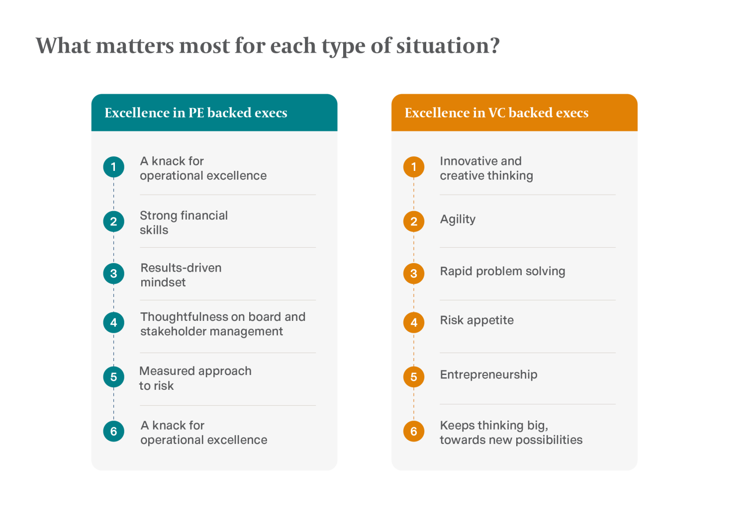 - Operational efficiency: There can be a fundamental difference between growth and optimization between VC and PE. Even in a growth PE scenario, there is a high premium placed on executives who can foster sustainable and efficient growth. VCs, however, tend to focus on developing products and finding a good market fit, with less immediate pressure to optimize existing operations.