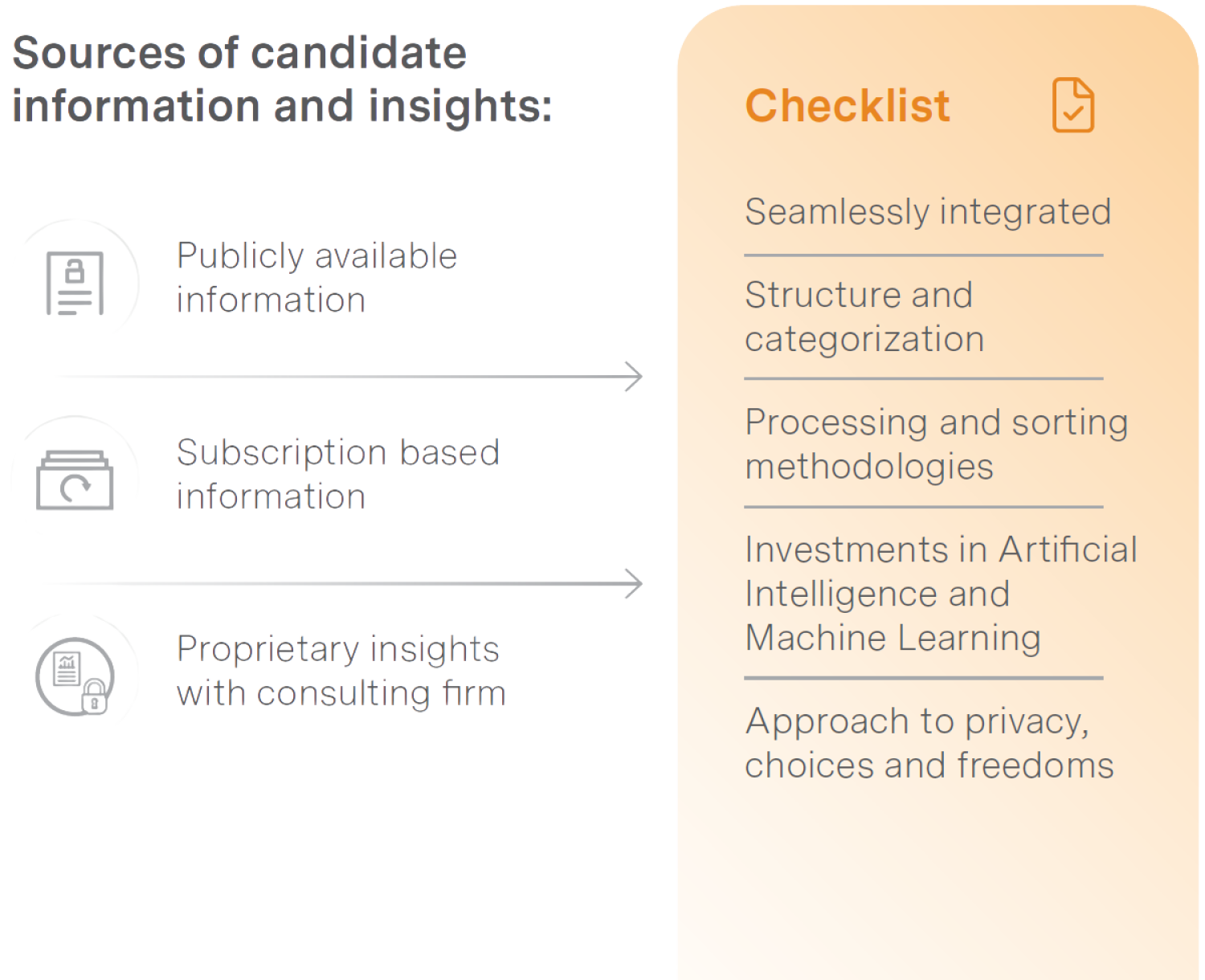 Most search firms have an ever-expanding database of individuals, driven by the explosion in computing power and the availability of data and information. These are complemented by public databases and subscription-based databases. True differentiation comes from the connectivity between these data pools and from deploying intelligent processing tools (increasingly, artificial intelligence and machine learning), and distilling the information into insights that add value in a search—without compromising individual privacy, choices and freedoms.