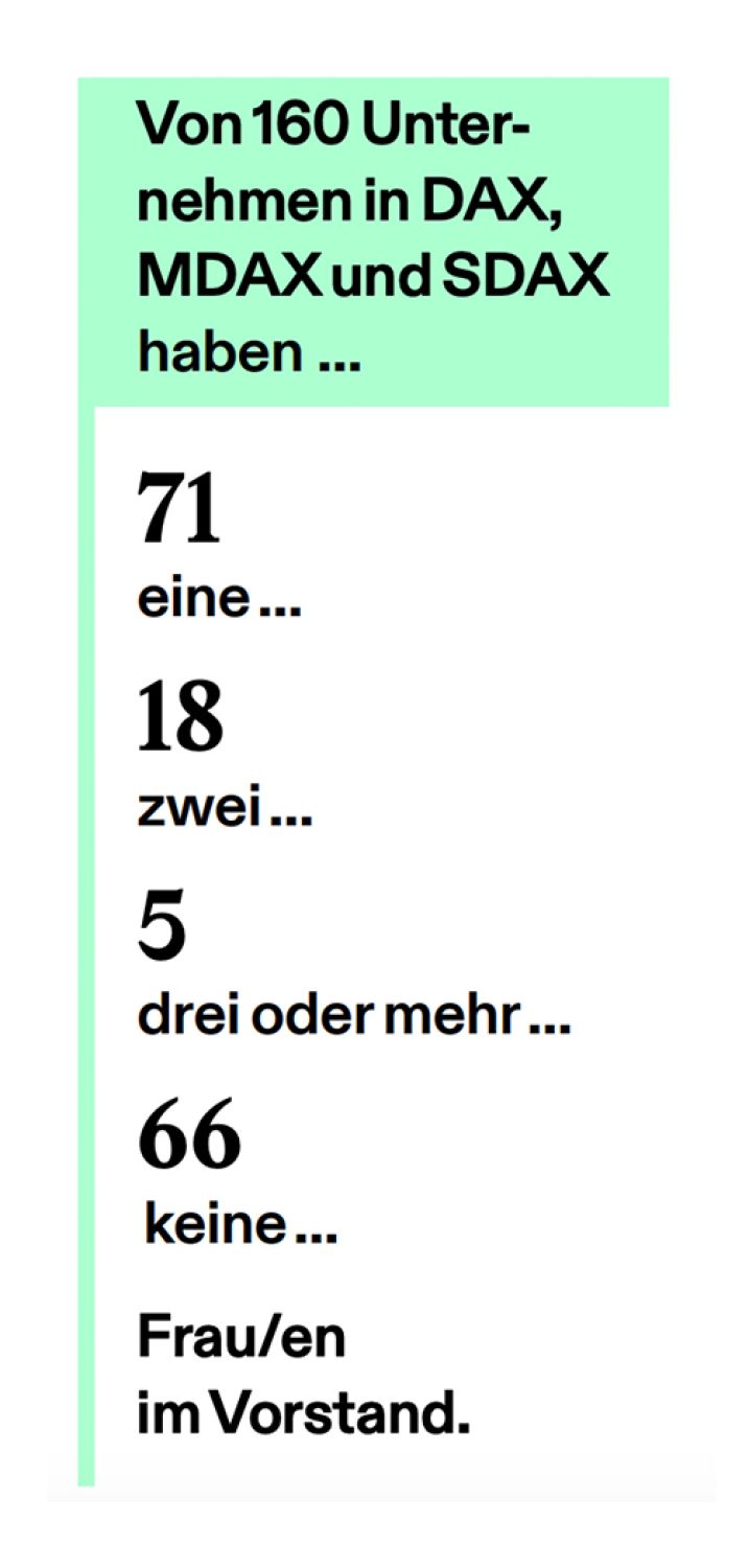 In deutschen Aufsichtsräten sitzen auf etwas mehr als jedem dritten Posten Frauen (gut 36 Prozent). In Vorständen sind es gerade einmal 17,4 Prozent. Die Top-40-Unternehmen aus dem DAX stehen zwar etwas besser da, doch der internationale Vergleich ist insbesondere mit Blick auf die Vorstände auch bei den Großen wenig schmeichelhaft: In den USA liegt der Anteil bei immerhin 32,6 Prozent. Auch Gremien in Großbritannien (29,5 Prozent), Frankreich (27,9 Prozent) und Schweden (27,2 Prozent) sind weiter als Deutschlands Top-40-Vorstände (23,2 Prozent).