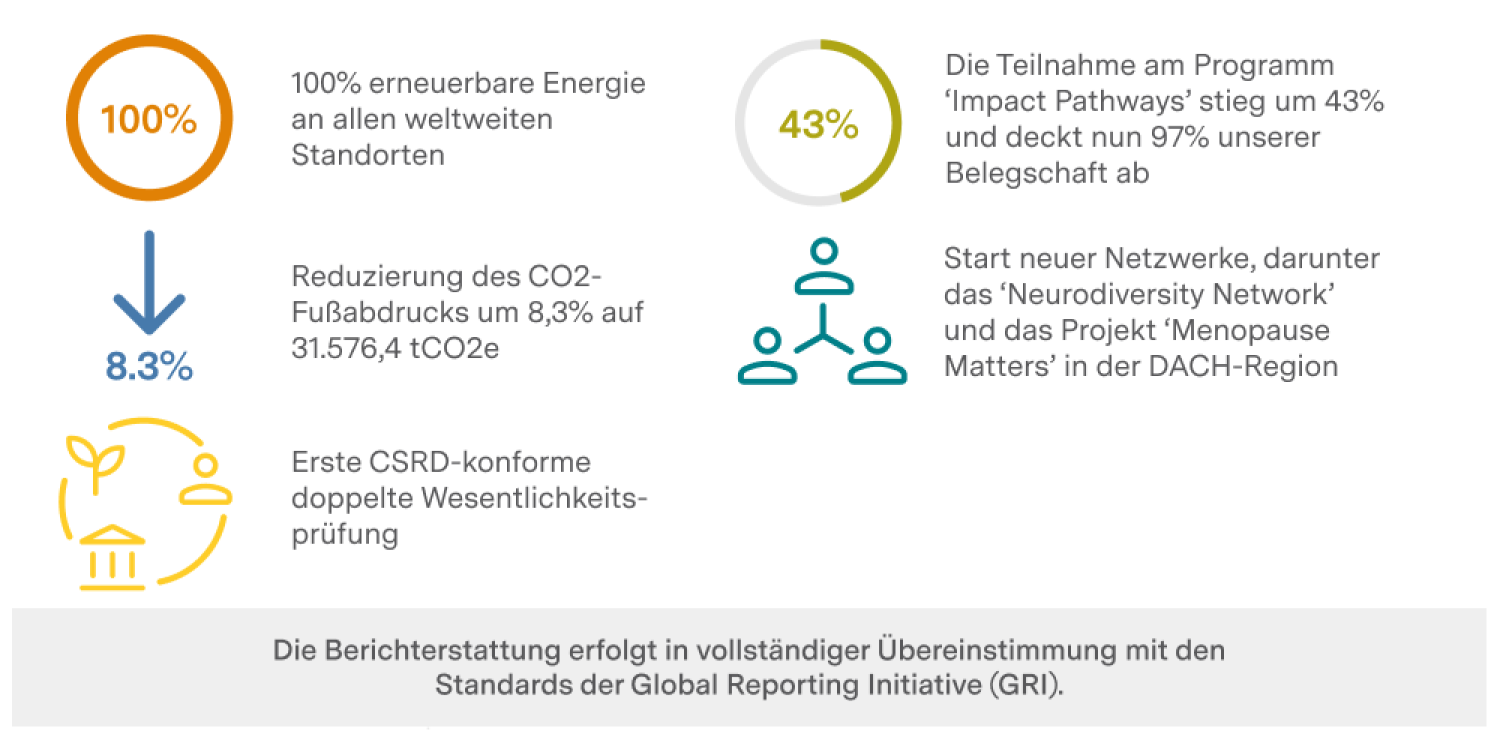 Unser Impact Report 2024 zeigt, welche Veränderungen wir bewirkt haben: So konnten wir unsere Standorte weltweit im Jahr 2024 mit 100 Prozent erneuerbarer Energie versorgen. Wir haben erstmals eine CSRD-konforme doppelte Wesentlichkeitsprüfung abgeschlossen. Und wir haben unseren CO2-Fußabdruck um 8,3 Prozent gesenkt. Die Beteiligung an unserer unternehmensweiten Initiative „Impact Pathways”, die Nachhaltigkeit in allen Unternehmensbereichen verankert, ist um 43 Prozent gestiegen.