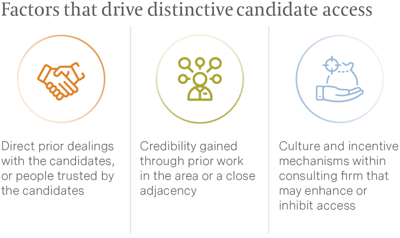 Distinctive candidate access goes beyond the ability to reach a candidate to differentiated non-public insights about candidates that can only come from the credibility, intimacy and trust that has been built up over time by individual consultants within a firm. The ability to share that access with their colleagues and clients in the most value-enhancing and responsible way is what makes the difference between knowing of a candidate and being able to bring them to the table to discuss an opportunity.