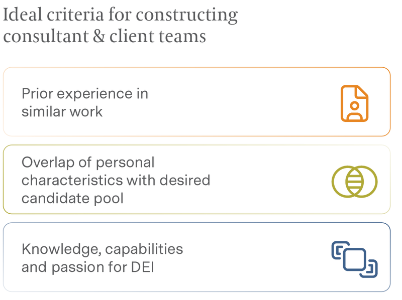 Beyond the points made earlier about consultant team and client composition and DEI knowledge, which still apply here, additional factors come into play when the client hiring team is not diverse and does not have a successful track record of attracting and integrating diverse talent onto the team. In such a case, we’d recommend providing additional support to the client team and bringing different client voices (beyond those directly involved in the hiring decision) into the decision-making and influencing structures from the get-go.