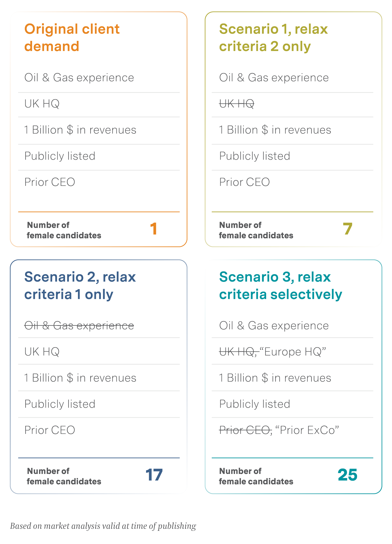 - A hybrid flexing of criteria is also possible. Say the client is unwilling to compromise on oil and gas experience, publicly listed company experience and the scale (revenue) of the business. However, they are willing to partially flex on geographical criteria (e.g., consider Europe in addition to the UK but not any further, and may be willing to consider any current C-suite leaders as opposed to just CEOs). Even this limited flex on just two dimensions (geography and seniority) dramatically increases the number of female leaders that you can consider to 25, an increase of 2,500 percent.