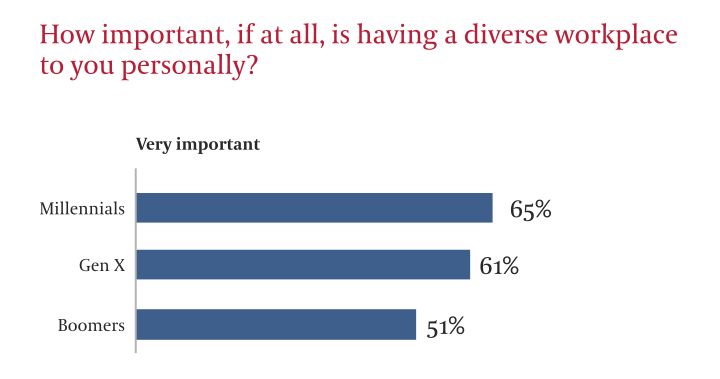 Male boomers in particular were not as focused on the value of diversity in the workplace, with nearly a quarter (23%) saying it was not important to them. Geographically, a diverse and inclusive workplace was more important to respondents in China (78 percent said it was very important) compared to those in Germany (44 percent said it was very important).