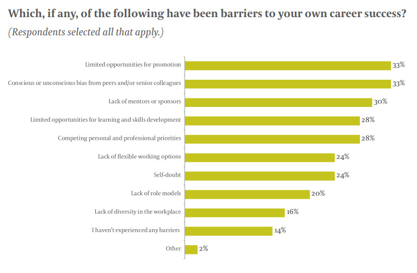 The vast majority of respondents (86%) have experienced some type of barrier during their career journeys. While barriers are often assumed to be experienced more acutely by women, 67 percent of male boomers said they experienced barriers during the course of their careers (72 percent of female boomers said the same). Perhaps because there’s more awareness about career barriers than there used to be, younger generations were more likely to have experienced them — 90 percent of male and female millennials and 85 percent of male Gen Xers and 86 percent of female Gen Xers reported such setbacks.