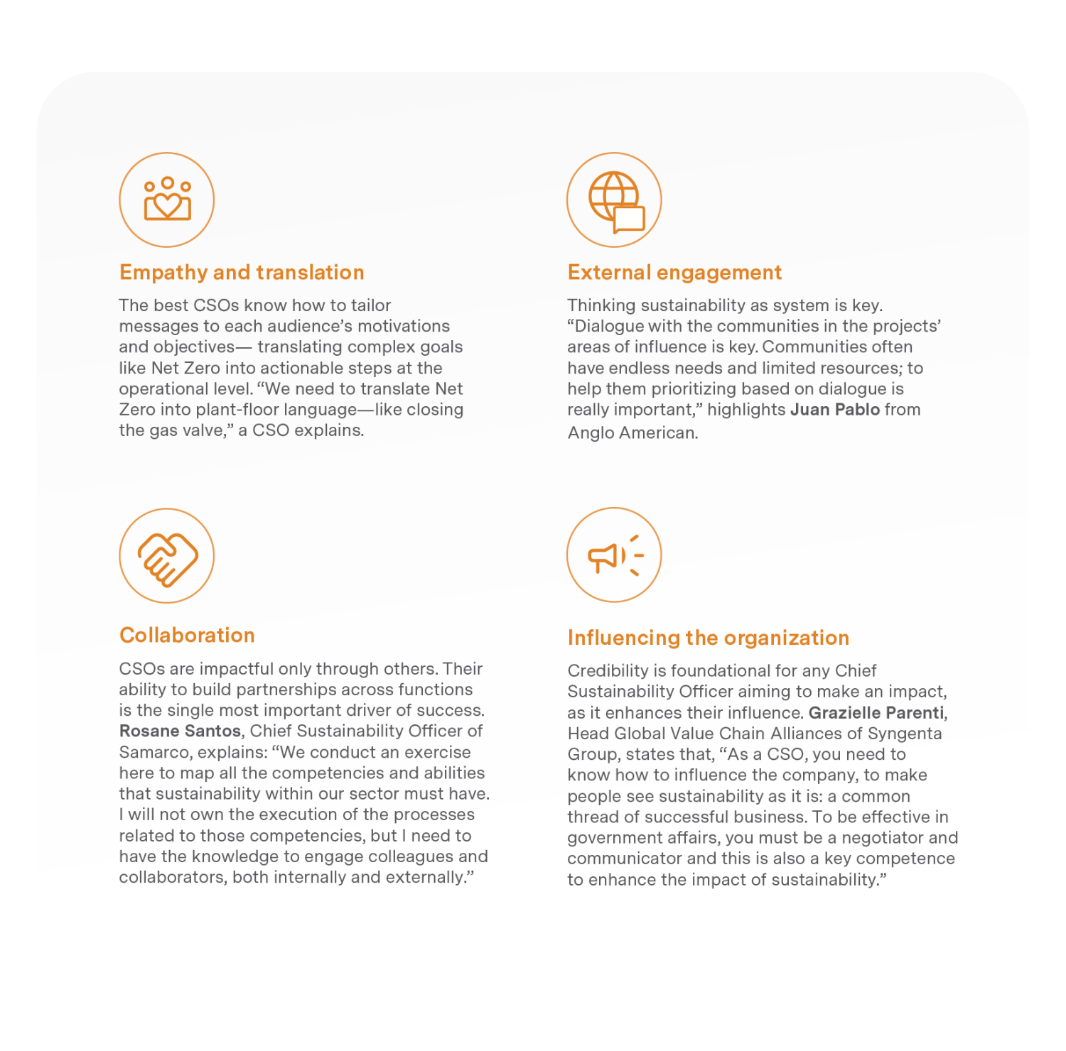 This spread highlights both progresses made and yet to be made. The CSO role is evolving not just in scope but in strategic ambition—and many are navigating that evolution in real time. As CSOs become more embedded in the business, they’re increasingly playing a connective role across functions. “We realized that it was key for sustainability to have a change management role and that it should be embedded in the processes. Process specialists need to understand the impact, the business case. Whether by conviction or convenience, but always with a business case,” explains one Chilean CSO.