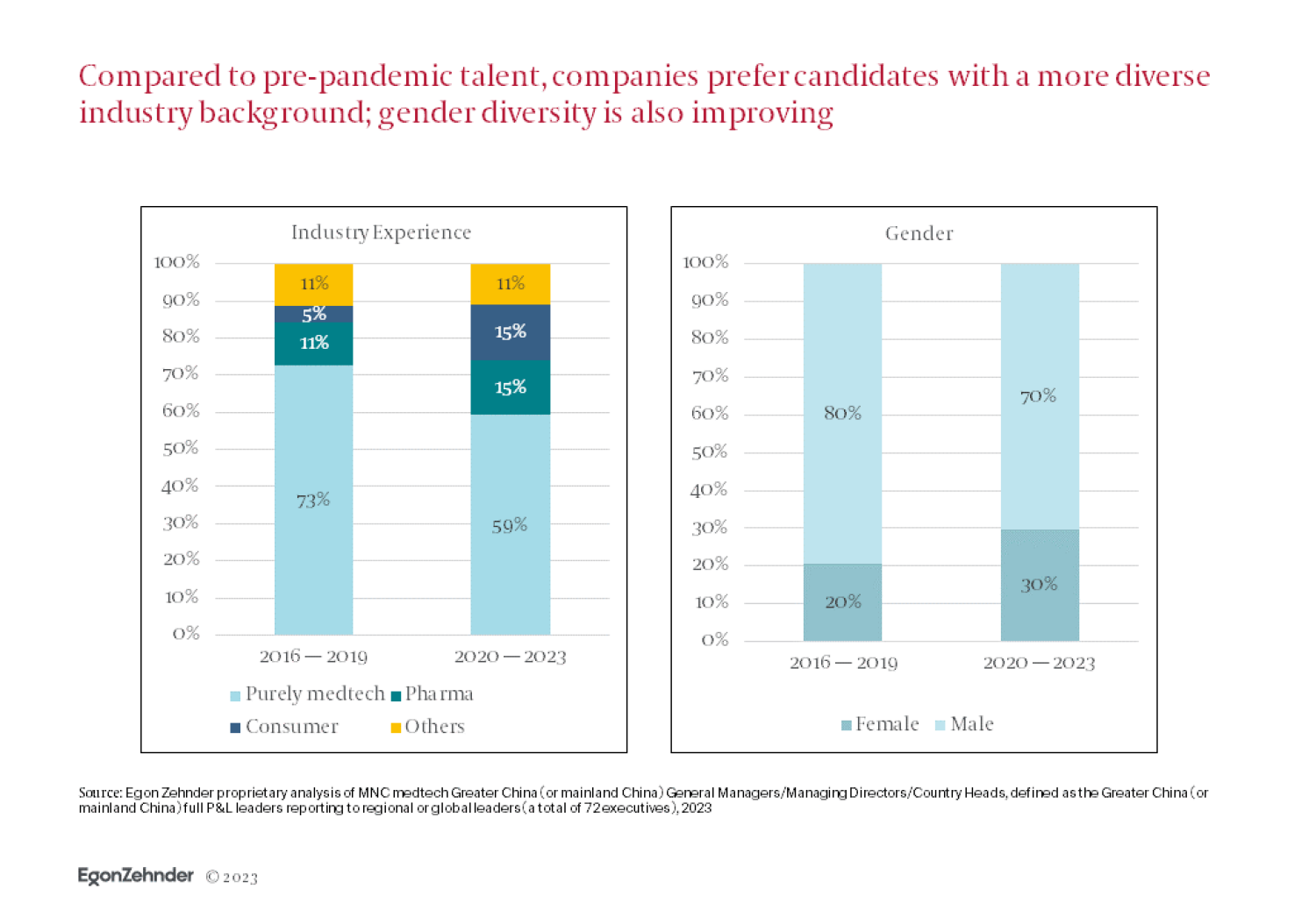 Just as the demands on leaders are increasing, China’s medtech companies face a shortage of candidates. In the face of this talent squeeze, many MNCs have adopted a more cautious approach in selecting their China general managers (GMs), with many opting to keep their current China GM. In the period between 2016 and 2019, approximately 61 percent of medtech companies replaced their China GMs within three years. Since 2020, however, this figure has declined to 38 percent.