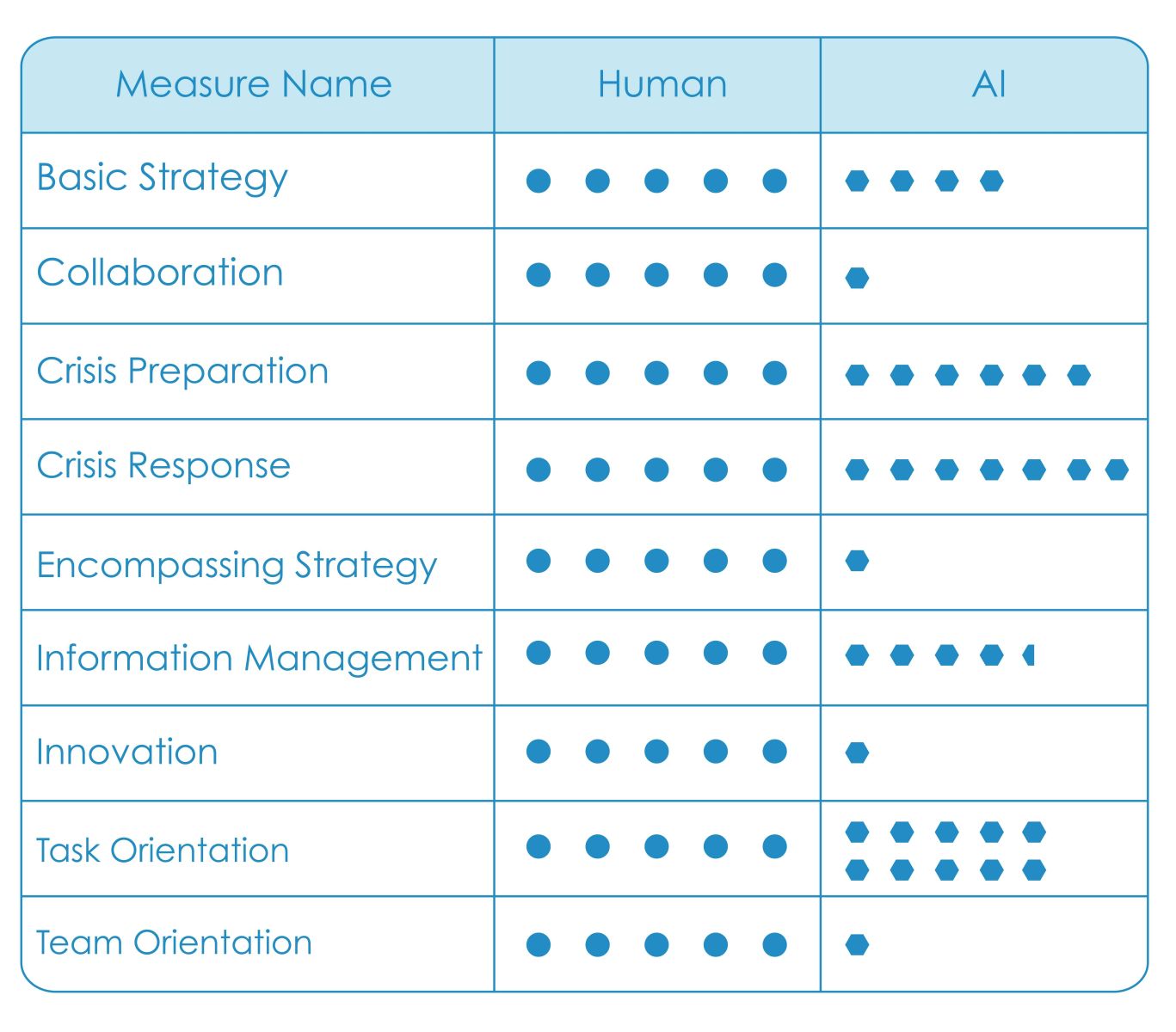 ChatGPT had a clear decrease in performance when it came to people skills, such as collaboration and team orientation. While ChatGPT can suggest relevant actions to help people in a crisis, it does so with a startling lack of collaborative effort- suggesting top-down, command-style actions, and largely ignores actions that would build teams such as sharing praise or communicating information in an effective manner. While AI is responsive to every stimulus and makes more decisions than an average human; it does lack the granularity and scope of thought processes that are characterized by team orientation, encompassing strategy or collaboration.
