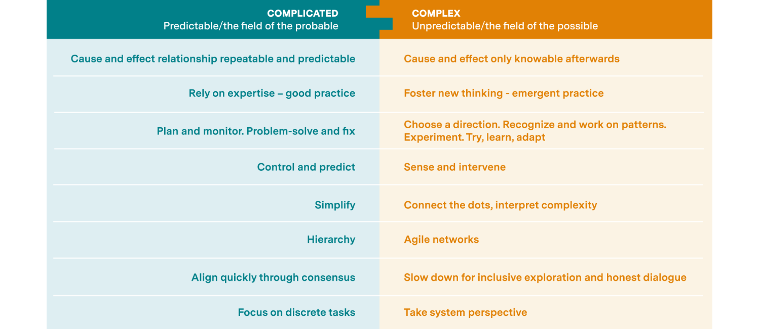 The critical first step for leading more effectively in the complex domain is to recognize the differences between ‘what is complicated’ and ‘what is complex.’ The seminal contributions of David Sowden remain foundational to this work, helping leaders distinguish between predictable and unpredictable contexts and environments. Through his Cynefin framework, Snowden encourages one to “make sense of the world in order to act in it” – a call to match context and approach. As he makes clear, it is essential that one first discerns the nature of the situation one is facing to adapt their approach, applying the right tools, behaviors and mindsets to address the issue at hand in a way that is contextually intelligent and effective.