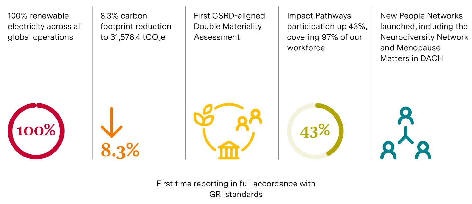 The report reflects a step change in how we understand, measure, and communicate our impact. We achieved 100% renewable electricity across global operations, completed our first CSRD-aligned Double Materiality Assessment, reduced our carbon footprint by 8.3%, and expanded participation of our firm-wide initiative designed to embed sustainability into every aspect of our operations, Impact Pathways, by 43%. These milestones, alongside new inclusion initiatives and deeper engagement with clients on sustainability, mark tangible progress in embedding purpose into how we lead, operate, and serve.