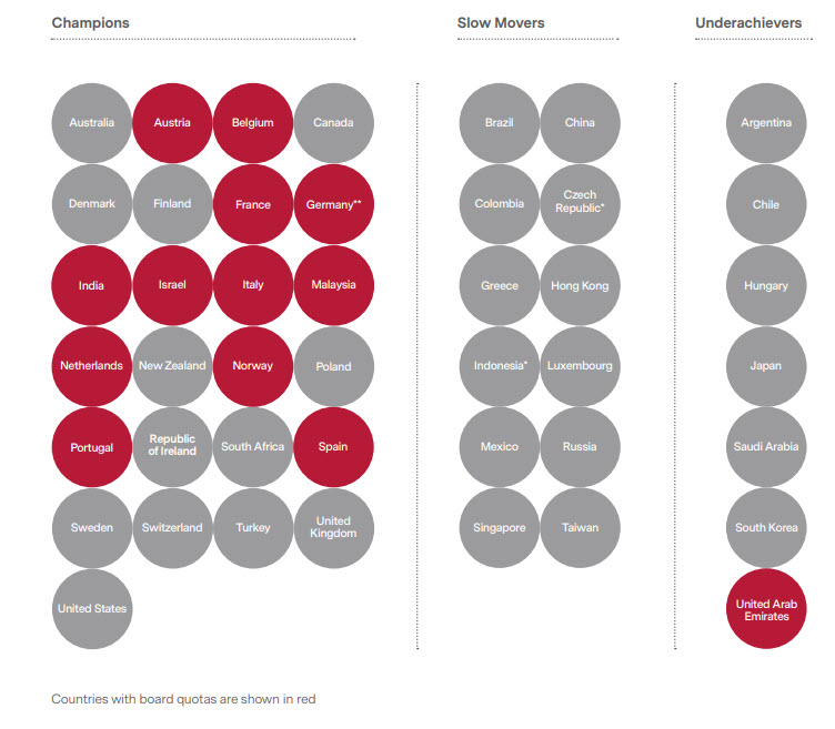 In the “Champions” category, we see countries that are making significant progress on board diversity. This may be driven by a good dose of public, shareholder and stakeholder pressure as well as regulation. It has also been a result of increasing numbers of women reaching the upper echelons of business.