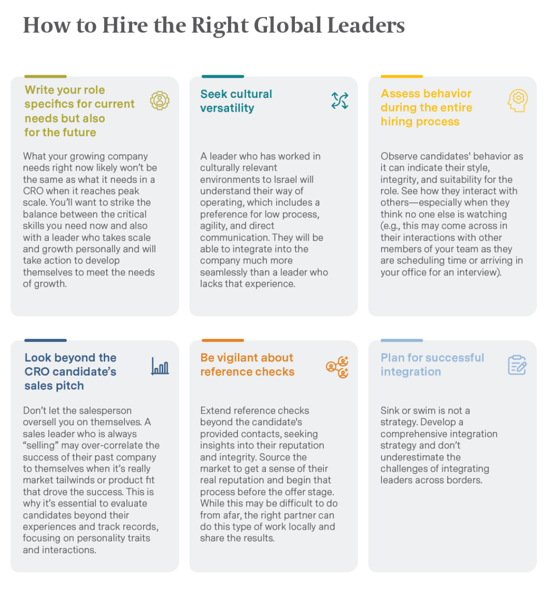 Challenges for finding the right CRO or sales leader center more on how best to assess leaders’ performance in other markets. Some Israeli founders have told us that they have made multiple international hires into the CRO role before finding the right fit, which isn’t without consequences. Not only does it slow growth but there can be an organizational deficit after each departure.
