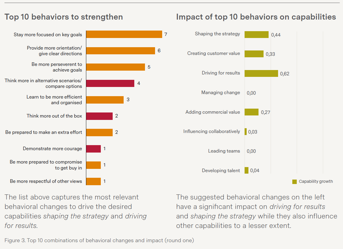 Among the behaviors the executive needed to strengthen, stay more focused on key goals and provide more orientation/give clear guidance stood out (the full list leads to the highest capability growth in the two leadership capabilities shaping the strategy and driving for results, while they also influence other capabilities but to a lesser extent).