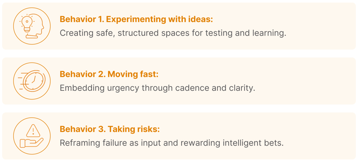 In adaptive cultures, three behaviors consistently differentiate organizations that adapt quickly and innovate at pace: experimenting with ideas, moving fast, and taking risks. These are grounded on the Egon Zehnder’s Culture Profile model, developed in collaboration with Professor Charles O’Reilly. Below, we break down what helps—and what hinders—each behavior